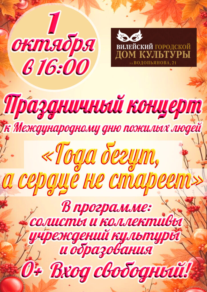 Приглашаем вилейчан и гостей нашего города на праздничный концерт «Года бегут, а сердце не стареет», приуроченного к Международному дню пожилых людей. Концерт пройдёт в Вилейском городском Доме культуры 1 октября, начало в 16:00. Ждём всех! Вход свободный, 0+.