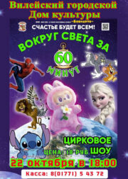 Запрашаем на цыркавое шоу!Прадзюсарскі цэнтр “Арт-Ап” прапануе новае анімацыйна-забаўляльнае шоу “Вакол свету за 60 хвілін”! Дадзенае шоў пройдзе ў Вілейскім гарадскім Доме культуры 22 кастрычніка, пачатак а 18:00. Шоу з’яўляецца вынікам доўгай і стараннай працы прафесійных цыркавых артыстаў і, ужо даўно ўпадабанага маленькаму беларускаму гледачу, тэатра роставых лялек “Банфарта” Дзіцячае анімацыйна-забаўляльнае шоу “Вакол свету за 60 хвілін” разлічана на дзяцей усіх узростаў і накіравана на забаўку, развіццё і выхаванне дзіцячага...