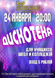 Запрашаем на дыскатэку 14+24 студзеня Вілейскі гарадскі Дом культуры чакае юнакоў і дзяўчат на палымяную дыскатэку 14+! Пачатак а 20:00! Уваход – 5 рублёў! Пры сабе мець дакумент, які пацвярджае асобу з указаннем даты нараджэння. Прыходзьце, будзе...