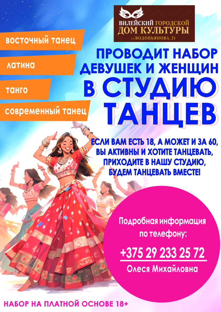 Паважаныя сябры! Вілейскі гарадскі Дом культуры праводзіць набор дзяўчат і жанчын, якія жадаюць навучыцца прыгожа танчыць. Інфармацыя аб наборы ніжэй. Чакаем усіх!