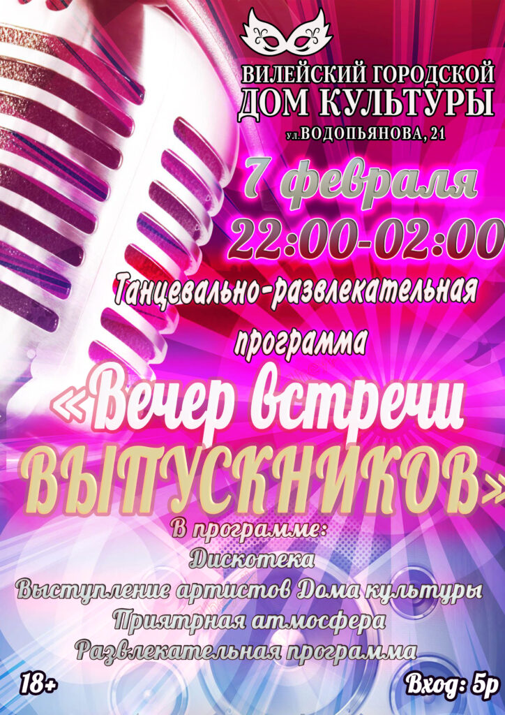 Запрашаем усіх выпускнікоў і не толькі 7 лютага ў 22:00, на танцавальна-забаўляльную праграму “Вечар сустрэчы выпускнікоў”. Уваход строга: 18+, кошт 5 руб.