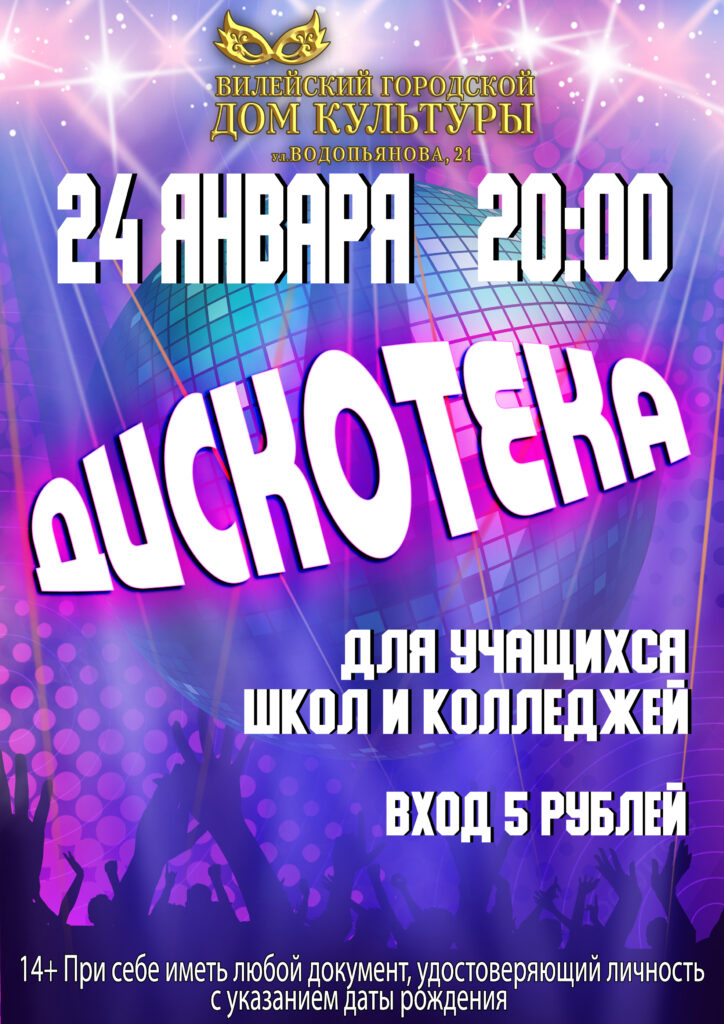 24 студзеня Вілейскі гарадскі Дом культуры чакае юнакоў і дзяўчат на палымяную дыскатэку 14+! Пачатак а 20:00! Уваход – 5 рублёў! Пры сабе мець дакумент, які пацвярджае асобу з указаннем даты нараджэння. Прыходзьце, будзе весела!