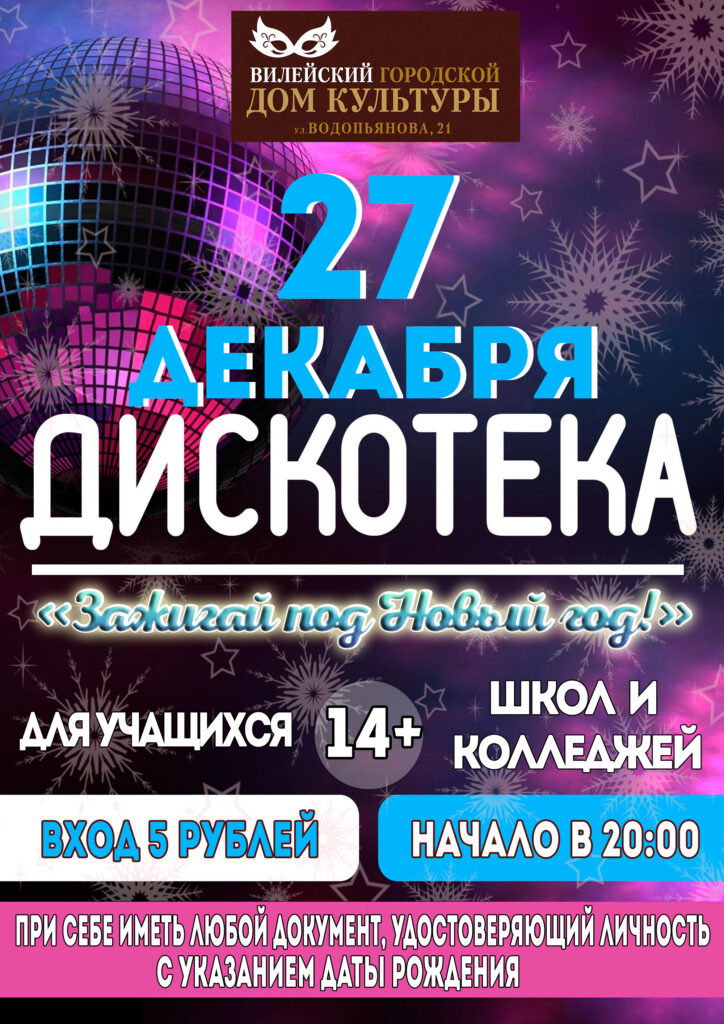 27 снежня Вілейскі гарадскі Дом культуры запрашае юнакоў і дзяўчат (узрост 14+) на Навагоднюю дыскатэку “Запальвай пад Новы год”. Пачатак а 20:00. Білет каштуе 5 рублёў. Пры сабе мець любы дакумент, які пацвярджае аркуш з указаннем даты нараджэння.