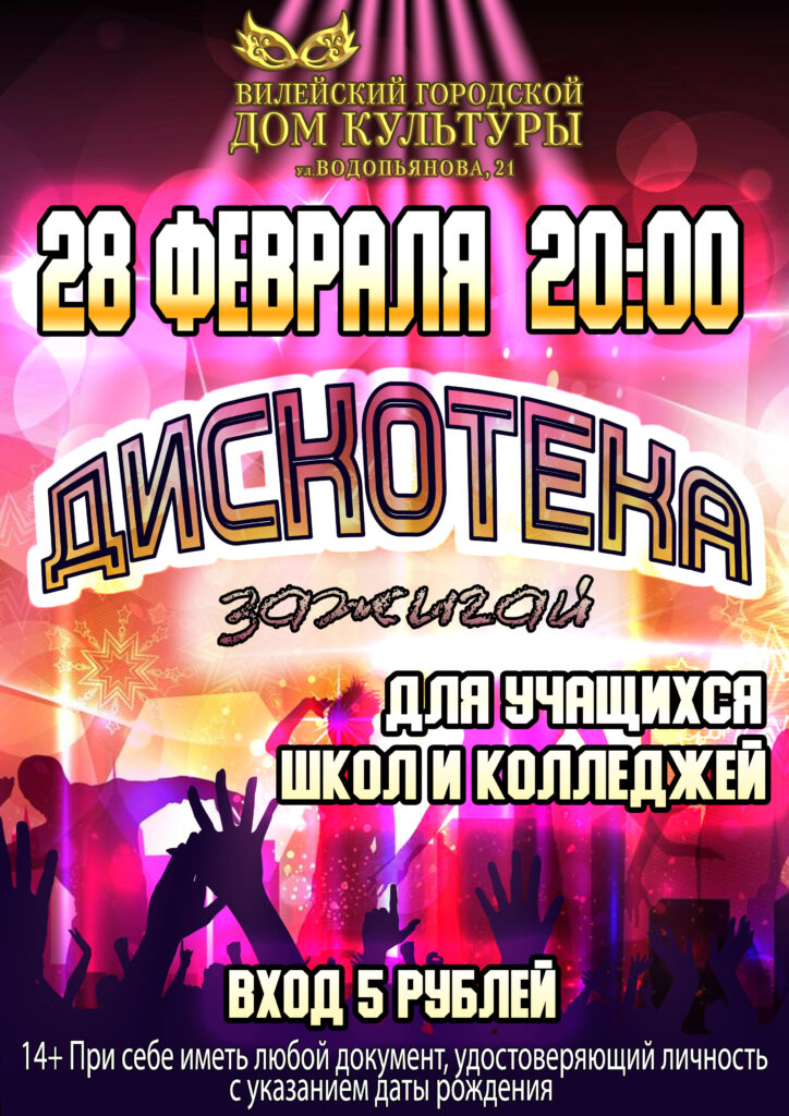 28 лютага Вілейскі гарадскі Дом культуры чакае юнакоў і дзяўчат на запальную дыскатэку «Запальвай» 14+! Пачатак а 20:00! Уваход – 5 рублёў! Пры сабе мець дакумент, які пацвярджае асобу з указаннем даты нараджэння. Прыходзьце, будзе весела!