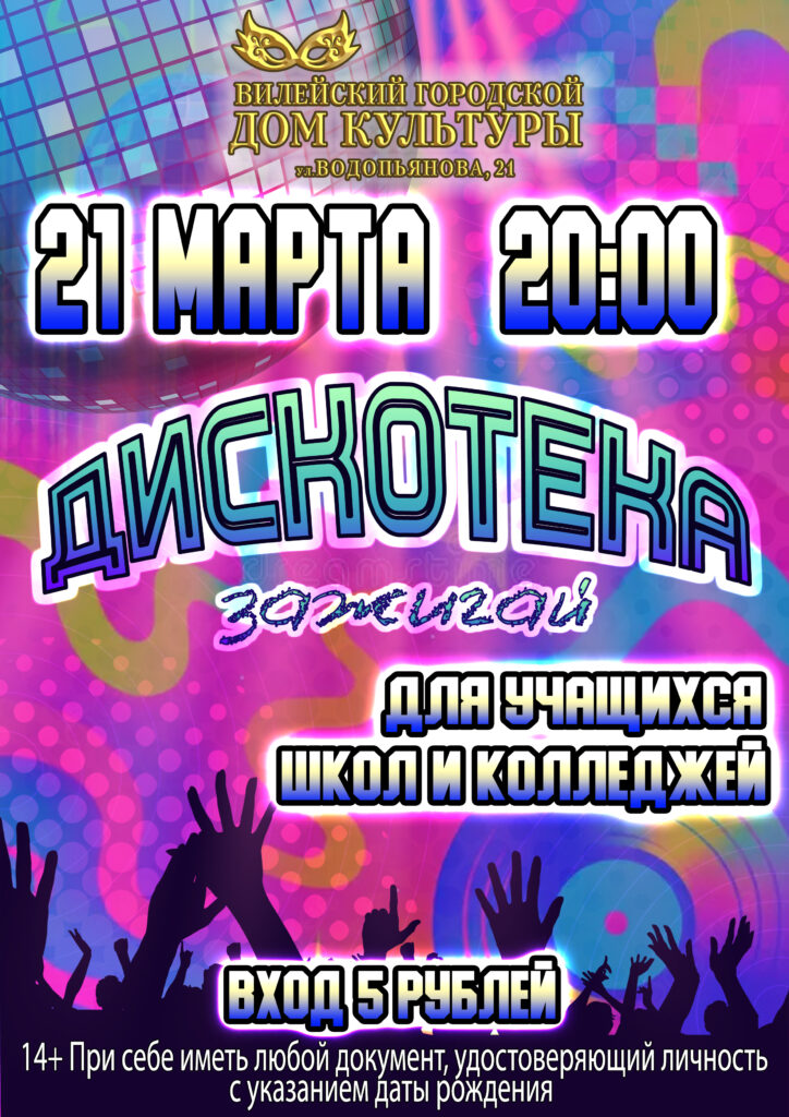 21 сакавіка ў 20:00 Вілейскі гарадскі Дом культуры чакае юнакоў і дзяўчат 14+ гадоў на запальную дыскатэку! Пры сабе мець любы дакумент з указаннем узросту. Прыходзьце! Будзе весела!