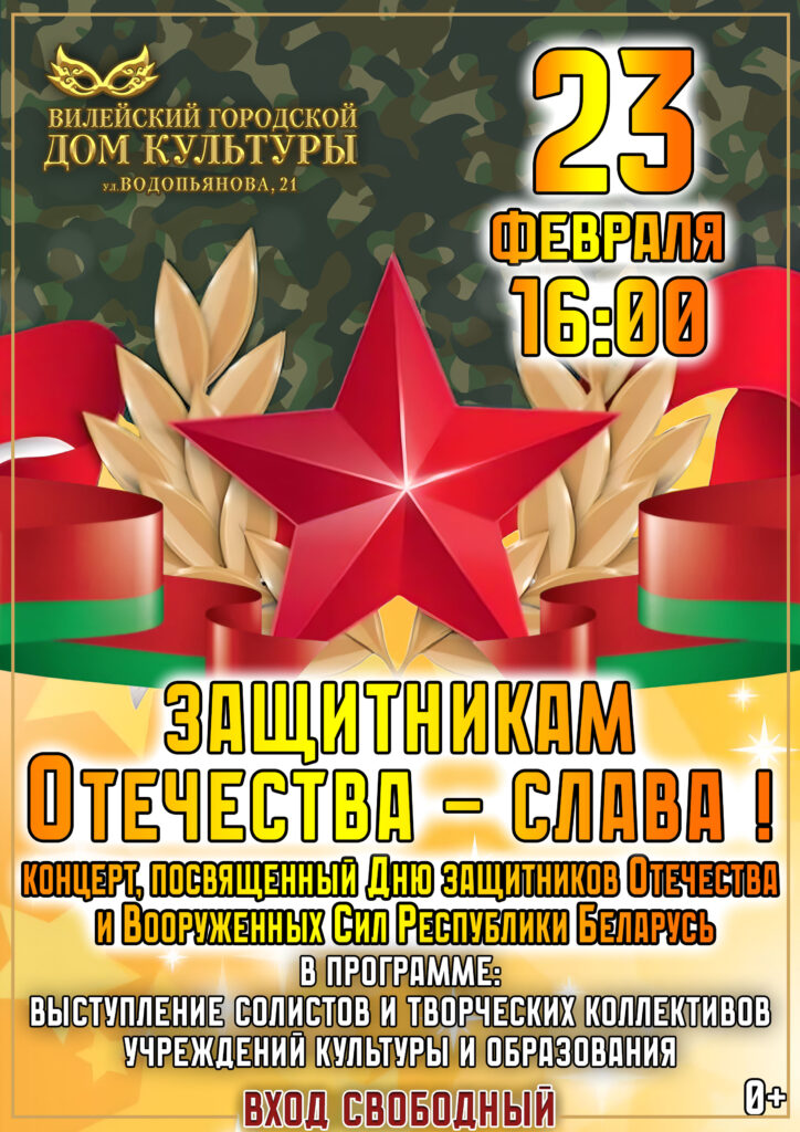23 лютага Вілейскі гарадскі Дом культуры запрашае жыхароў і гасцей нашага горада на святочны канцэрт да Дня абаронцаў Айчыны і Узброеных Сіл Рэспублікі Беларусь. Пачатак у 16.00. Уваход вольны, 0+. У праграме – выступленне салістаў і творчых калектываў культуры і адукацыі. Прыходзьце, чакаем усіх!