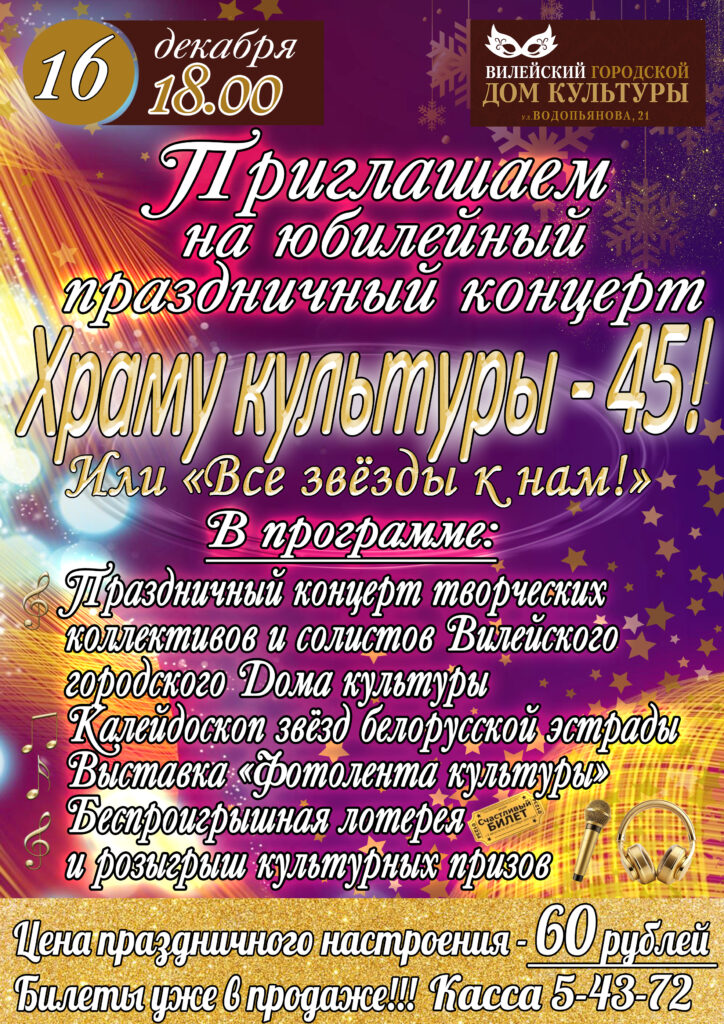 Паважаныя вілейчане і госці нашага горада! Вілейскі гарадскі Дом культуры запрашае 16 снежня а 18:00 на юбілейны святочны канцэрт “Храму культуры – 45! Або “Усе зоркі да нас”. У праграме творчыя калектывы і салісты Дома культуры, калейдаскоп зорак Беларускай эстрады, выстава “Фаталента культуры”, а таксама бяспройгрышная літарэя і розыгрыш культурных прызоў. Кошт білета: 60 руб. Білеты ўжо ў продажы!