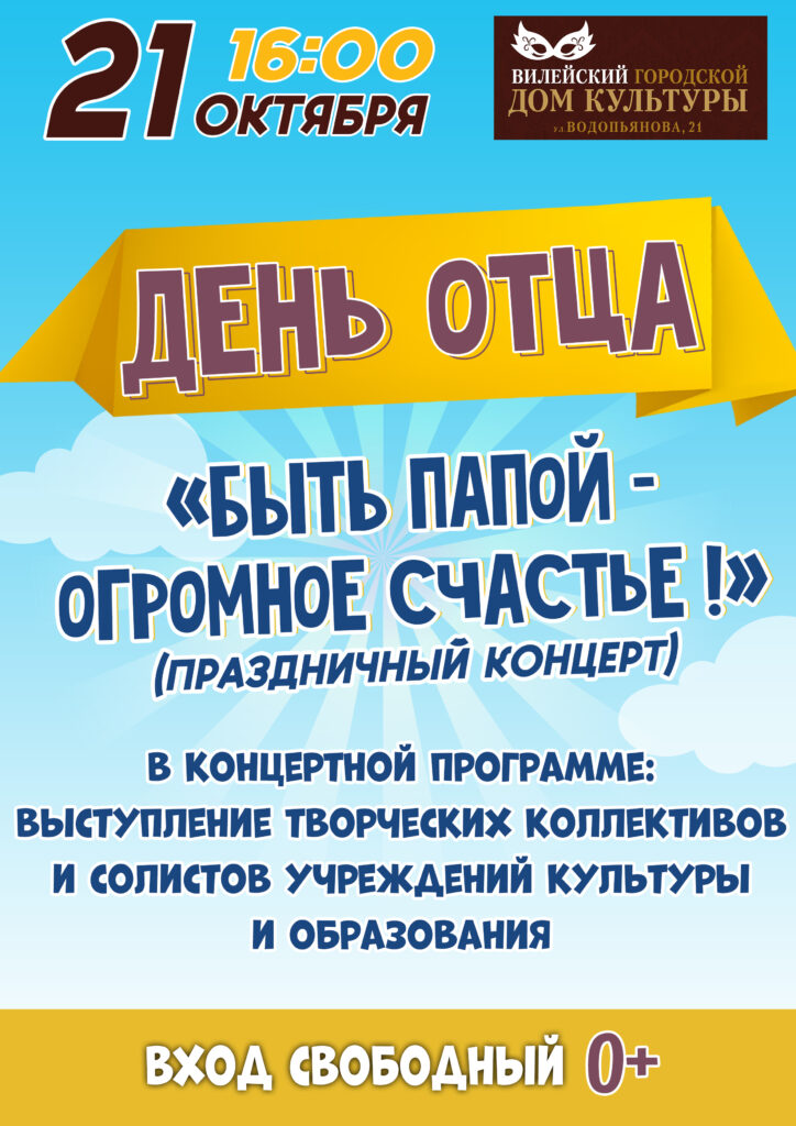 Дарагія вілейчане і госці нашага горада! Запрашаем вас на святочны канцэрт да Дня бацькі, які адбудзецца 21 кастрычніка ў Вілейскім гарадскім Доме культуры. Пачатак у 16.00. Уваход вольны, 0+. Прыходзьце, чакаем усіх!