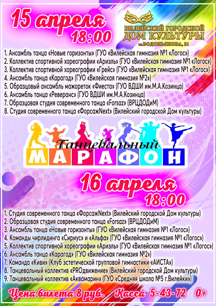 Дарагія прыхільнікі танцавальнага мастацтва! Вялейчане і госці нашага горада! Увага! 15 і 16 красавіка ў Вілейскім гарадскім Доме культуры адбудзецца традыцыйны штогадовы Танцавальны марафон! Пачатак а 18:00. На адной сцэне выступяць дзіцячыя, юнацкія і дарослыя танцавальныя калектывы.