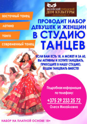Проводим набор в студию танцевУважаемые друзья! Вилейский городской Дом культуры проводит набор девушек и женщин, желающих научиться красиво танцевать. Информация о наборе ниже. Ждём...