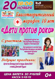 Приглашаем на благотворительный марафон «Дети против рака»Уважаемые вилейчане и гости нашего города! Приглашаем Вас 20 ноября в 18:00 на благотворительный марафон «Дети против рака». Хедлайнеры марафона: народная артистка Республики Беларусь Ядвига Поплавская и Заслуженный коллектив Республики Беларусь ансамбль народной музыки «Бяседа». Цена билета 30р. Телефон для справок...