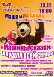 Приглашаем на детскую анимационную программуДетская анимационная программа «Машины сказки», где детки не просто смотрят спектакль, а учавствуют в нем. Приглашаем вилейчан и гостей города 19 ноября в 18:00 в Вилейский городкой Дом культуры. Вас ждет встреча с любимыми героями. В течении программы детки будут играть с Машей, танцевать с Мишкой, ловить мыльные пузыри, веселиться с серебряной бумагой, а родители будут наслаждаться эмоциями своих детей. Количество билет ограничено, чтобы деткам было комфортно, а герои смогли уделить внимание каждому. Стоимость билет: детский- 10р, взрослый 5р....