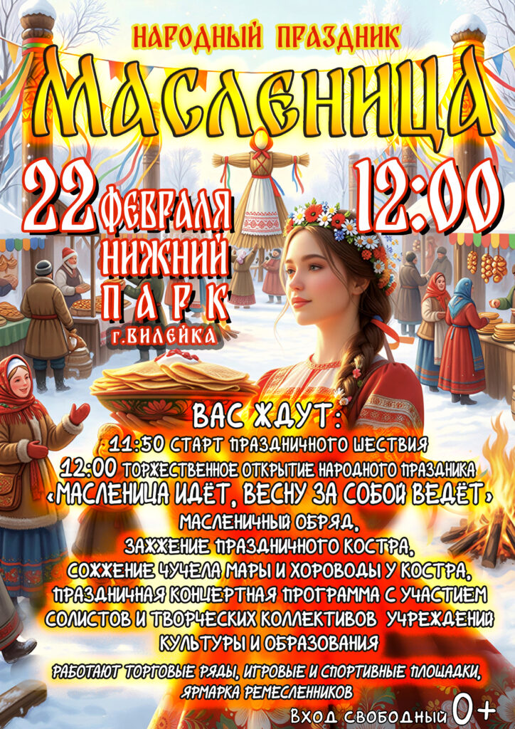 Дорогие друзья! Уже совсем скоро — 22 февраля состоится любимый всеми народный праздник «Масленица»! Мы приглашаем всех жителей и гостей города Вилейки отпраздновать его вместе! В программе праздника – праздничное шествие, масленичный обряд, сожжение чучела Мары и концертная программа с участием солистов и творческих коллективов учреждений культуры и образования.